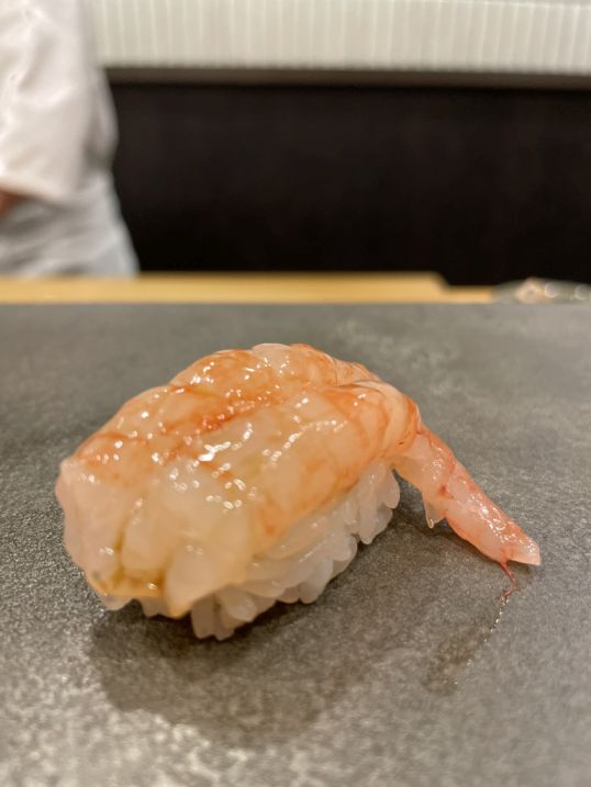 The 6th sushi is a raw sweet prawn (ama-ebi). Soft, glossy, and incredibly sweet. Almost creamy, with a light crunch at the start, tasting like cold seawater touched with sugar.