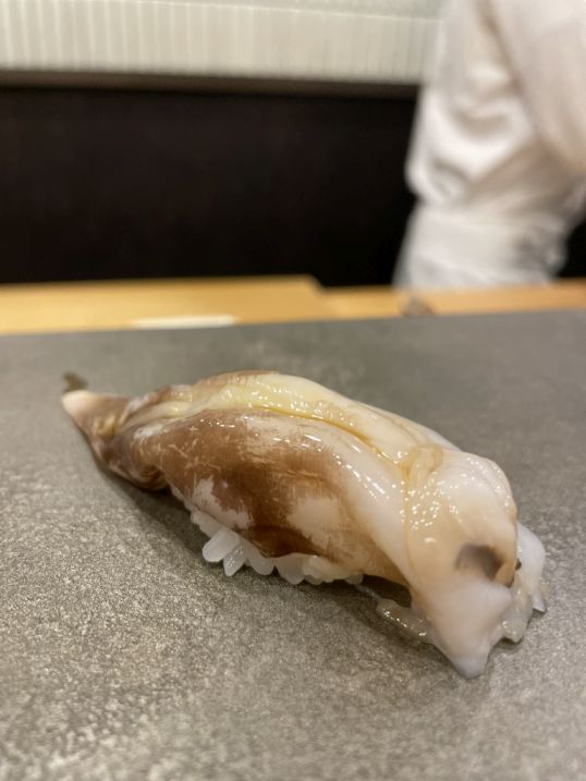 The 3rd sushi is an abalone that is also brushed with soy sauce. Firm and chewy in a pleasant way, with a deep ocean flavor. The soy sauce added richness, turning something simple into something earthy and satisfying.