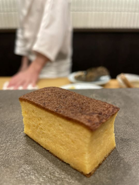 After the last pieces of sushi, the chef quietly prepared dessert. We watched as he placed a slice of castella onto a simple, rectangular gray slate plate, the soft golden cake standing out beautifully against the cool stone.