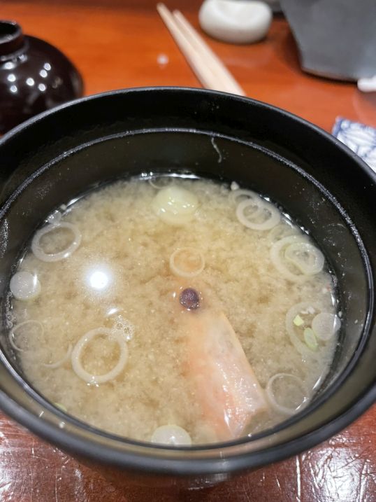 Then came a final bowl of miso soup, warm and fragrant, with scallions floating on the surface and the shrimp head tucked inside, deepening the broth with its rich aroma.