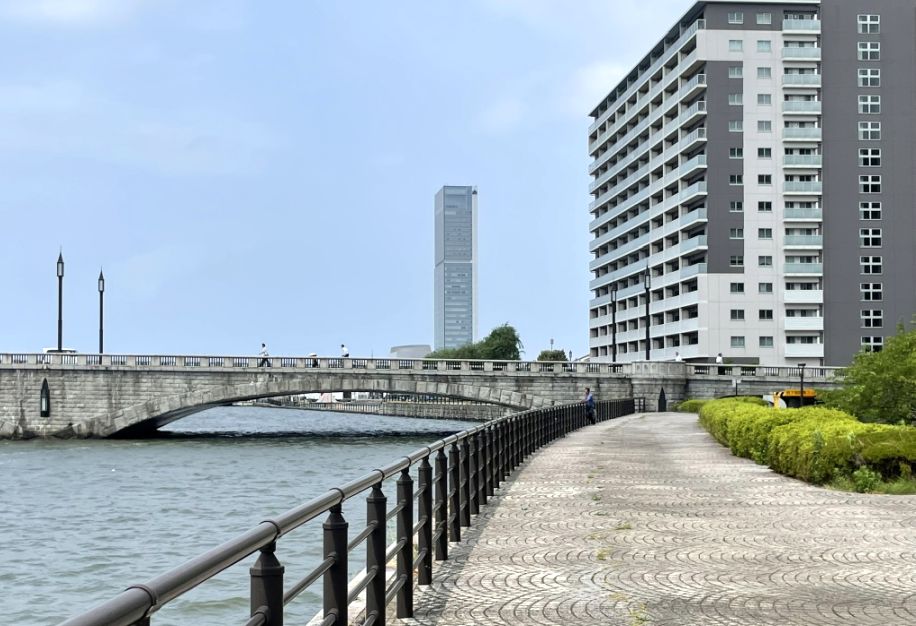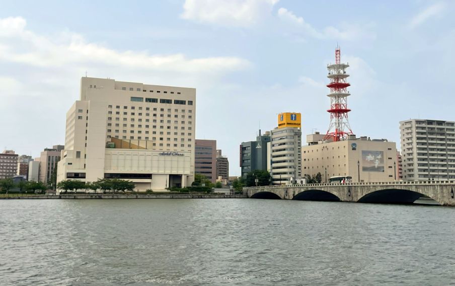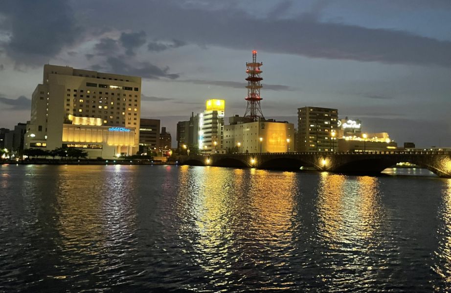 As we came closer to Hotel Nikko Niigata, the riverfront path widened into a long, neatly paved walkway. A low metal railing ran alongside it, separating the promenade from the water below. On the other side rose the base of the hotel, a long stretch of floor-to-ceiling glass windows that glowed softly from the lights inside, like a bright ribbon along the river’s edge.