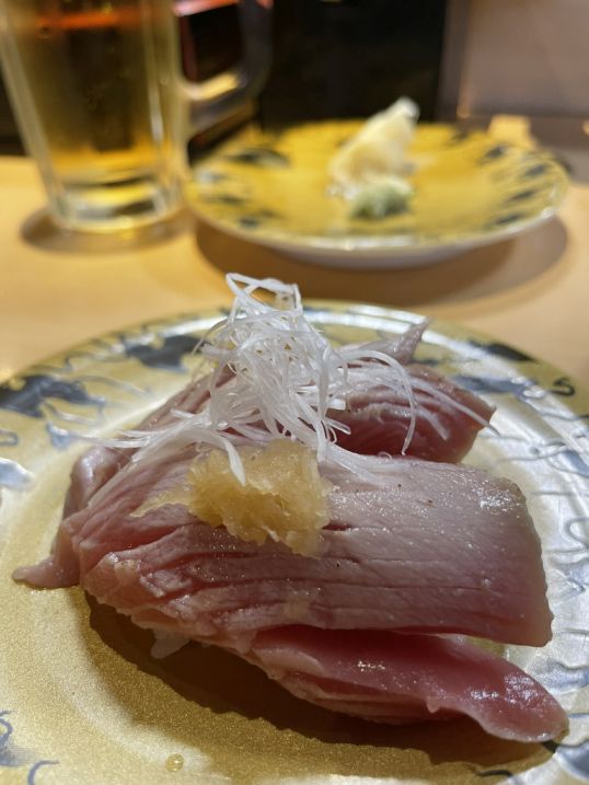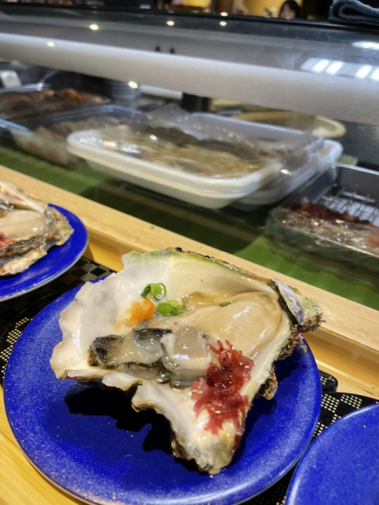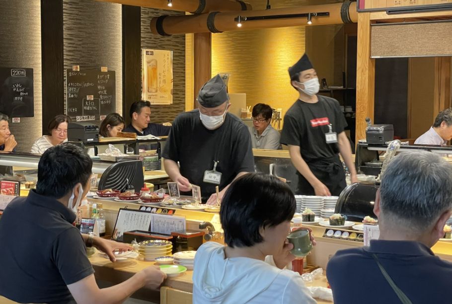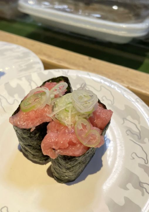 What surprised us most was how fast everything moved. In the U.S., conveyor-belt sushi often feels slow, with plates sitting too long before anyone takes them. But here, it was completely different. The dishes barely had time to circle the counter before someone reached out and grabbed them. Plates disappeared almost as soon as they appeared, replaced instantly by new ones.