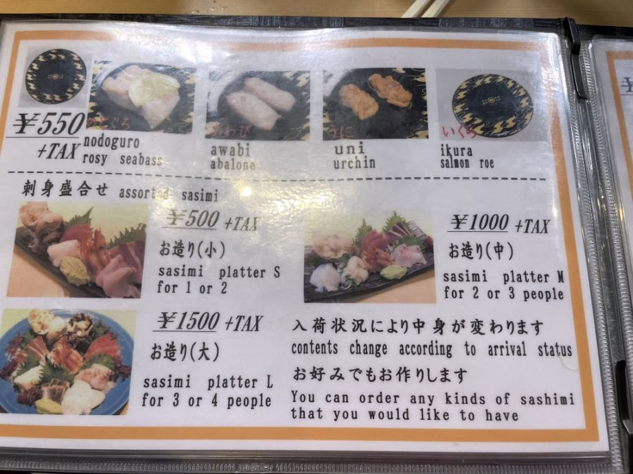 We seleced the sashimi platter for 2 at 1,000 yen = $6. 32 - We could not beleive how cheap the price are.