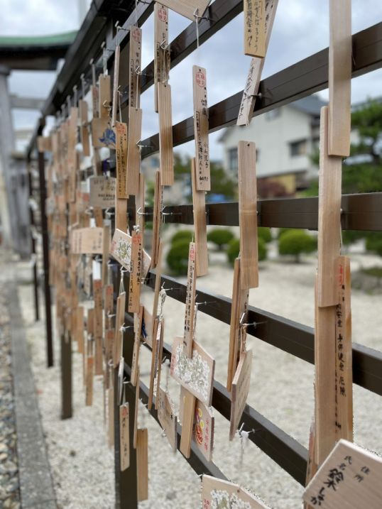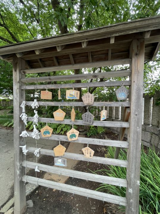 As we wandered deeper into the grounds, one area immediately caught our attention. A few dozens of small wooden plaques, called Ema, were hanging neatly together, each covered in handwritten Japanese characters.