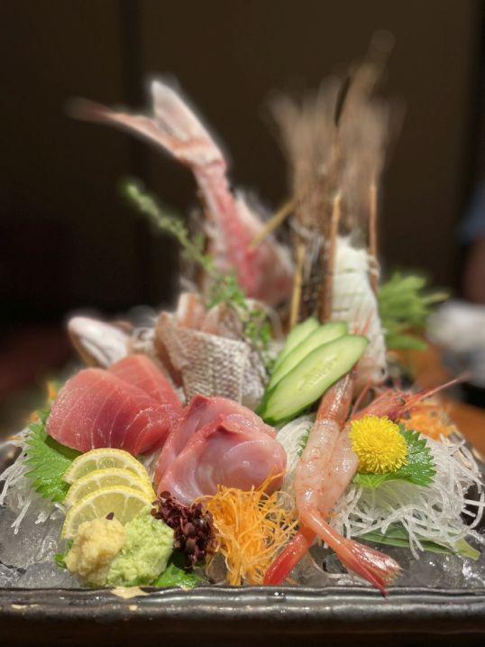 We ordered a variety of sashimi. Ebisudai is a master class in Japanese aesthetics, often designed to mimic a natural landscape. The presentation typically balances colors, textures, and height to create a "visual masterpiece". The presentation follows Mountain and River principle, meaning that the chef often place taller elements (like a garnish of shiso leaves or the "mountain") at the back and lower elements (the "river") at the front to create a sense of depth.