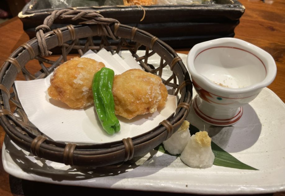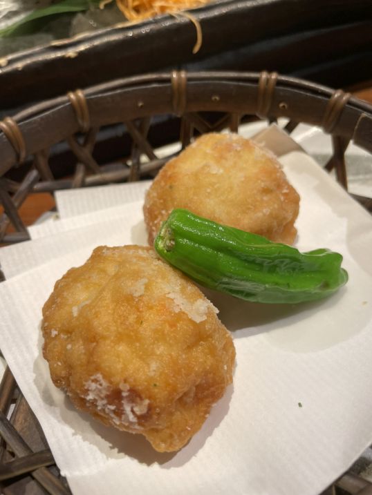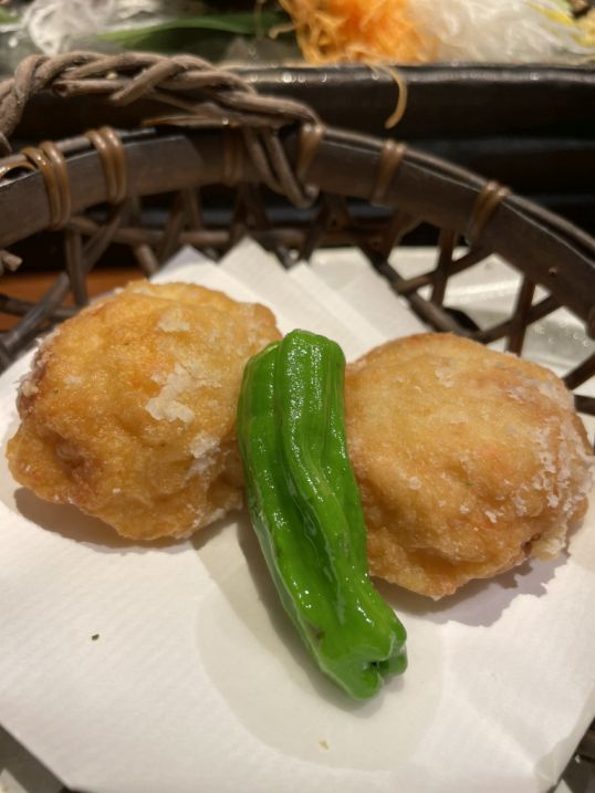Ebi Shinjo (fried shrimp Balls), it is a prized Japanese delicacy made by blending minced shrimp with grated mountain yam (yamaimo) and egg whites to create an incredibly light, fluffy texture.