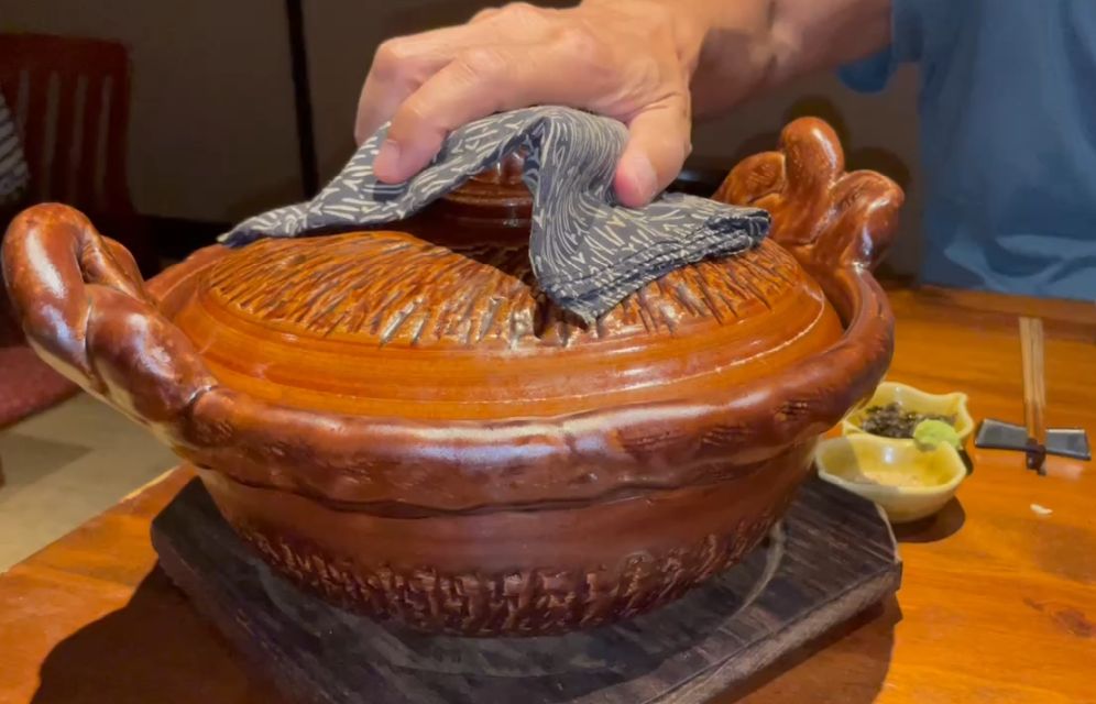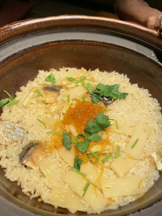 On top of the rice are Bamboo shoots are a classic addition to add a crunchy texture, while the salmon roe (ikura) provides a burst of salty, briny flavor that seasons the rice perfectly. One of the best parts of this dish is the okoge, the thin layer of crispy, caramelized rice that forms at the bottom of the clay pot.