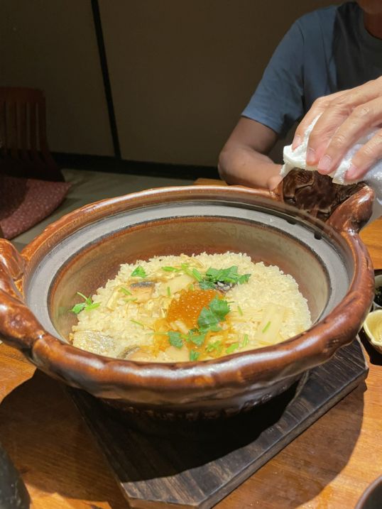 We ended the meal with a Kamameshi (clay pot rice) served in the Ochazuke style. When we lifted the lid, steams came out.