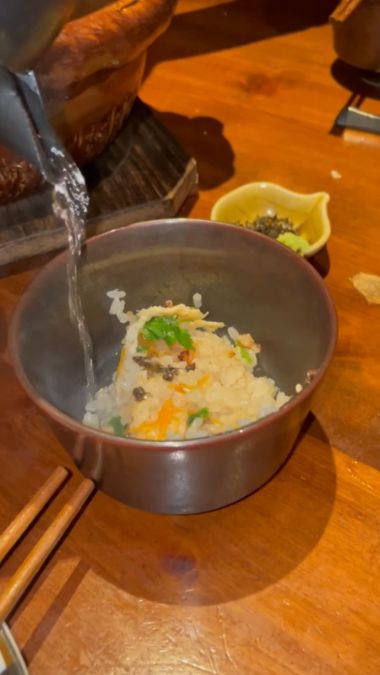 Next we scooped the rice into a small bowl and then we poured the broth from the kettle over the rice, is called Ochazuke. While "Ocha" means tea, in high-end restaurants, they usually provide a refined Dashi (fish and kelp stock) rather than plain tea. This helps lift the "okoge" from the bottom of the pot so you don't miss a single grain of that flavorful, crispy rice.
