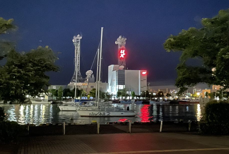 Boats docking at night.
