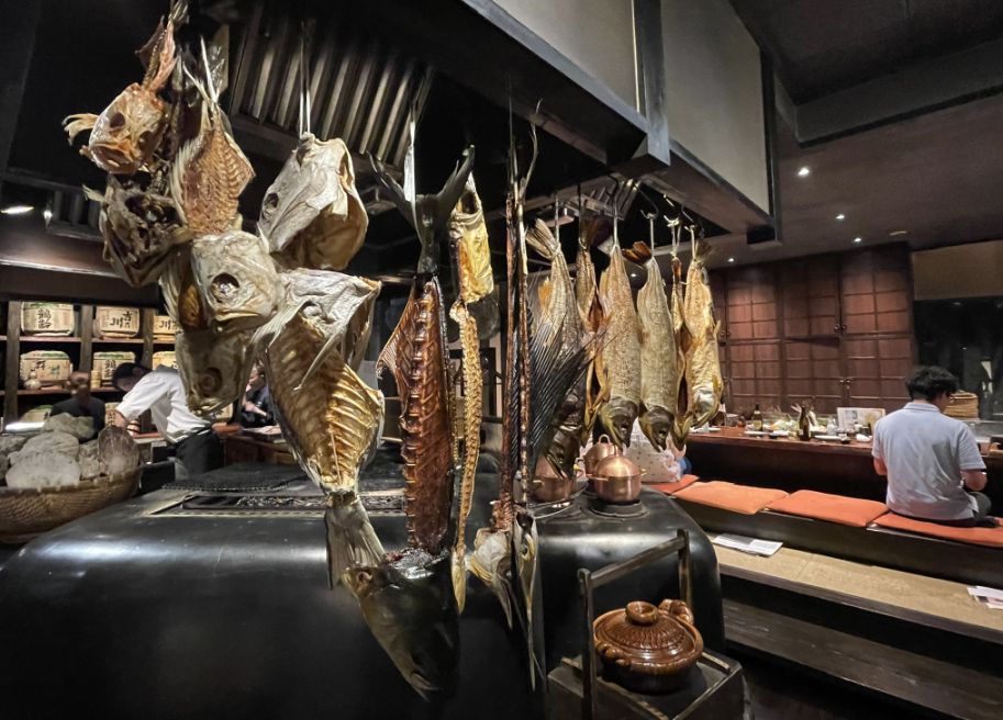 In the past, drying fish was essential for surviving long winters, and many izakaya adopted this style to show the quality and abundance of their catch. Here, the hanging fish create a rustic, almost theatrical atmosphere, part storehouse, part fisherman’s kitchen. The air feels warm and smoky, the wood darkened with age, and the space filled with the soft clatter of dishes and low conversation.
