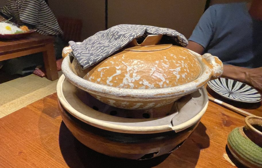 On our table was a donabe, a traditional Japanese earthenware pot sitting over a small round ceramic charcoal brazier called a shichirin. Together, they form a simple tabletop grill, the kind used long before modern stoves, perfect for gently cooking seafood without drying it out.