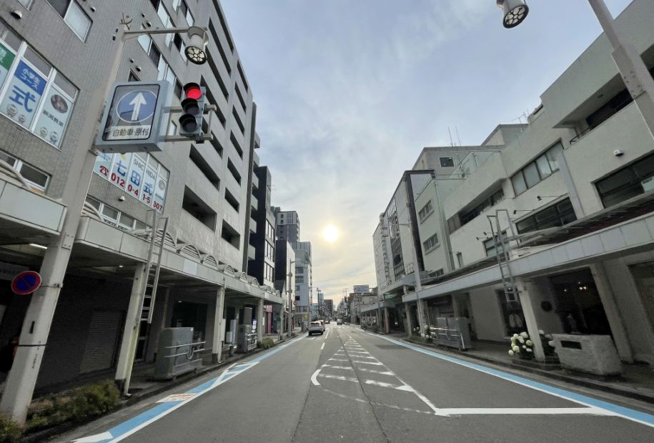 I am now walking on route 116, also known locally as Masaya-koji, this section is lined with a mix of large department stores, banks, and smaller specialty shops. It acts as the main artery connecting the "old" Furumachi district to the "new" Bandai City area across the bridge.