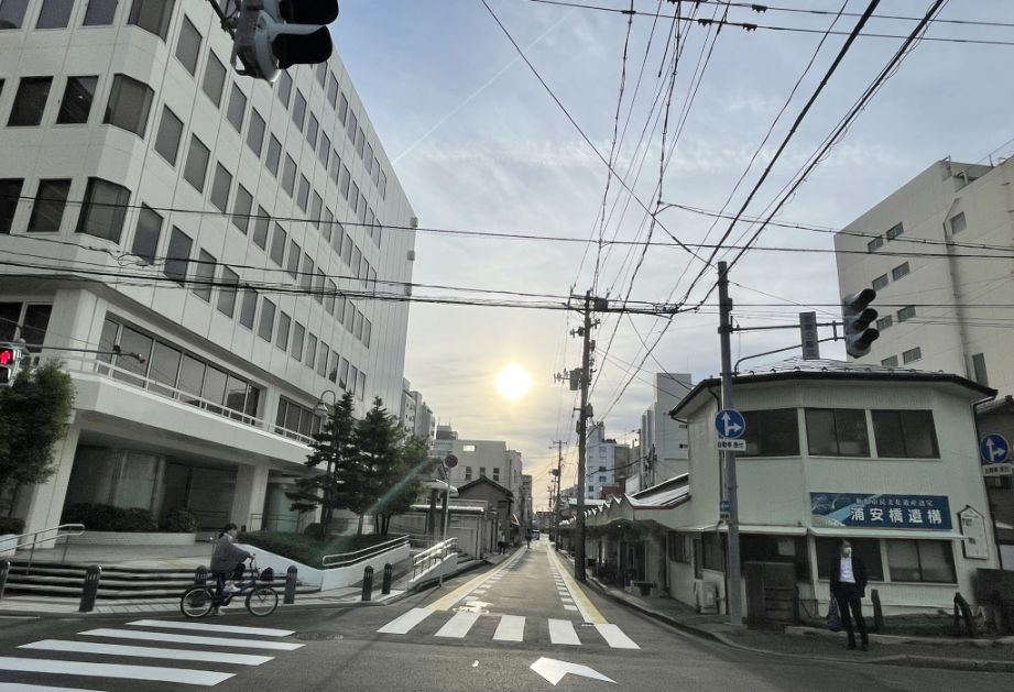 Standing on the bridge, and looking straight ahead and toward the end of the bridge is the Bandai area (New Town).