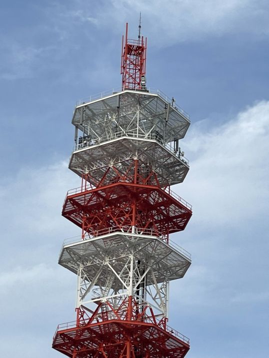 The tower is painted International Orange and White (appearing red and white). In Japan, any structure taller than 196 ft. must be painted this way or have high-intensity lighting to warn low-flying aircraft.