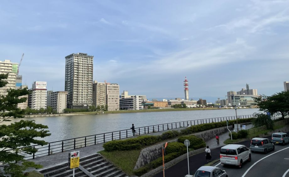 From the riverbanks near the Bandai Bridge, we have one of the best views in the city. The landscape changes here from the historic Furumachi side to the modern Bandai and Bandaijima districts.