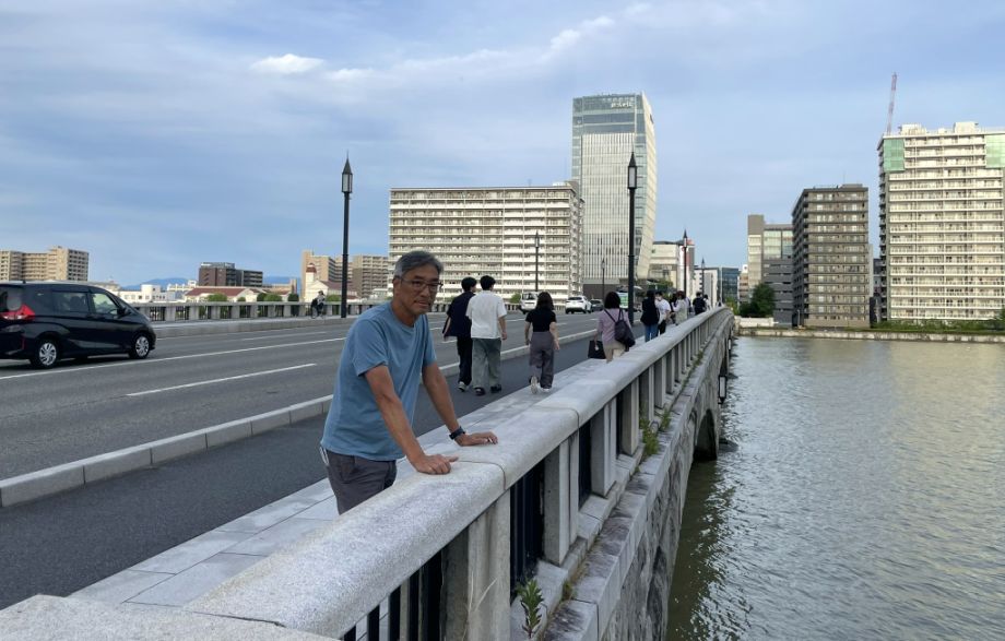 As we are crossing the bridge I am looking back at the Furumachi District (Old Town).