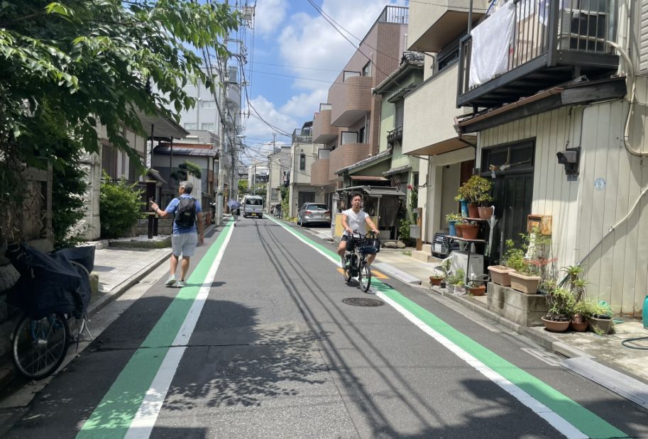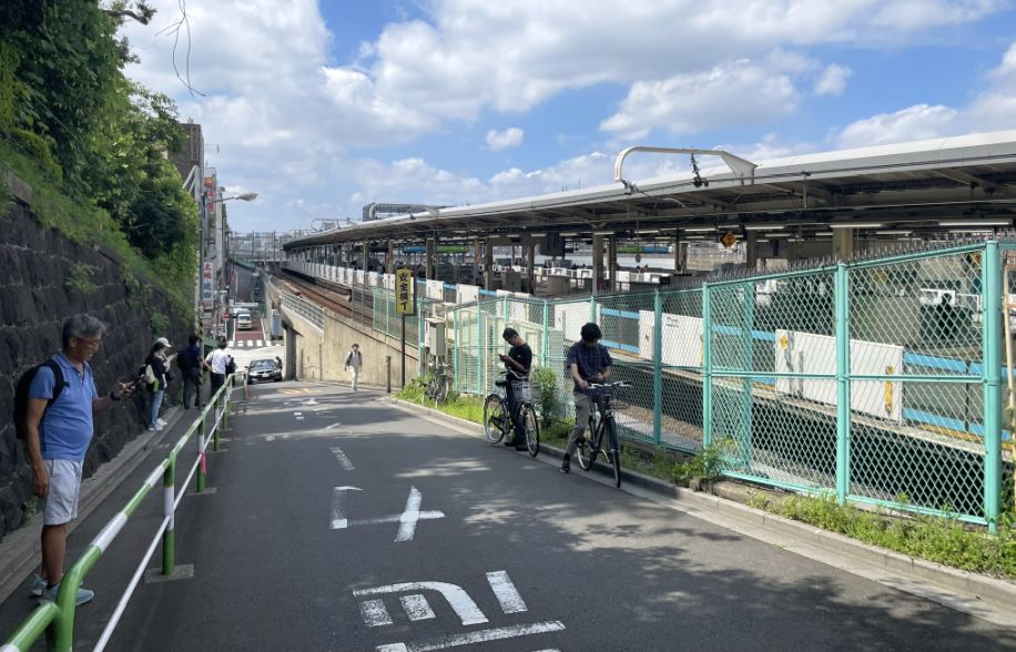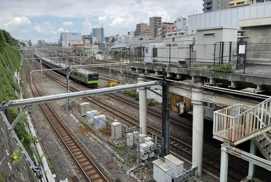 As we crossed the bridge, train tracks opened up below us, and a green JR train slid past quietly between the buildings, one of those everyday Tokyo scenes where modern life moves straight through old neighborhoods.