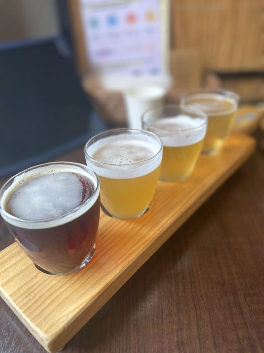 We both ordered a tasting set of four different beers, small glasses lined up like a little flight, each one a different shade of gold and amber.