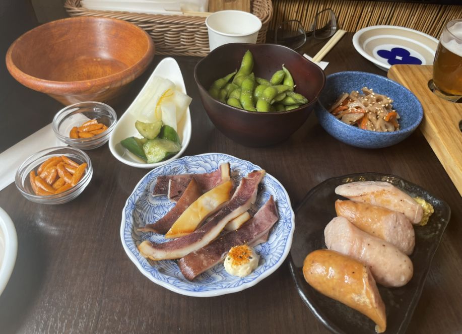 Along with them came plates of grilled squid, juicy sausages, tiny sausages with cucumber, edamame, and a simple but refreshing bowl of lotus root mixed with sesame and carrot. Everything tasted fresh and comforting, perfect with the cold beer.