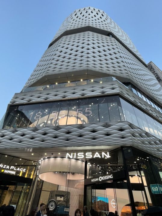 We are headed to the Nissan Crossing (Nissan Ginza Gallery). The building is modern, bright white, and very minimalist, it almost looks like a sculpture itself among the luxury boutiques.