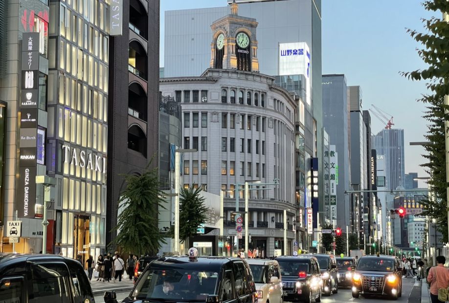 On the left, the elegant cream-colored building with the clock is the Wako Department Store, owned by Seiko. Built in 1932, it’s one of Ginza’s most important landmarks.