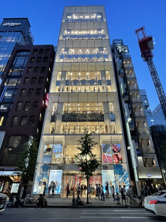 Uniqlo Flagship store is one of the most famous Uniqlo locations in the world, visible from far down the street. At night, when the lights are on and people are moving up and down the escalators behind the glass walls, it feels almost like watching a living display case.