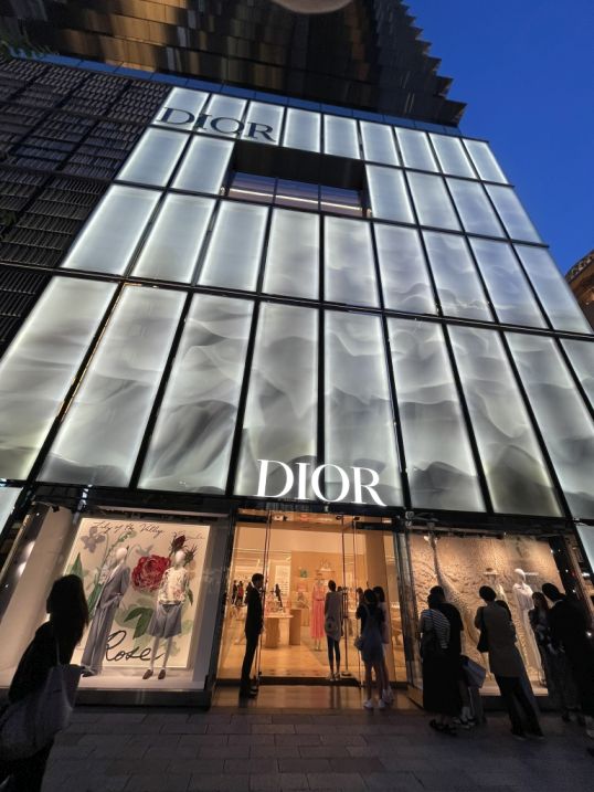 The Dior building is one of the most striking. At night its huge façade glows in a soft, milky white light, created by layers of translucent glass that look like folded fabric. The windows don’t clearly reveal the inside; instead, the whole building becomes a lantern , elegant, calm, and unmistakably Dior.