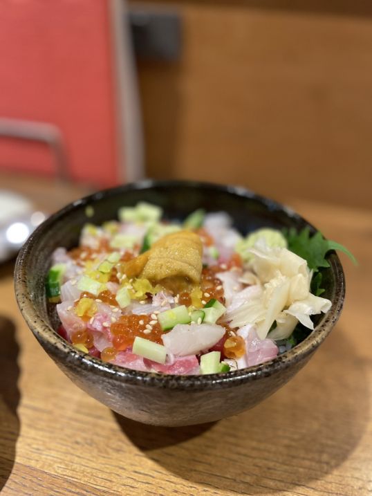 Then arrived a beautiful sashimi rice bowl, a mound of warm rice completely covered with glistening slices of raw fish, more uni on top, and a scattering of cucumber and sesame seeds. The combination of cool fish and warm rice, creamy sea urchin and crunchy cucumber, was simple but unforgettable.