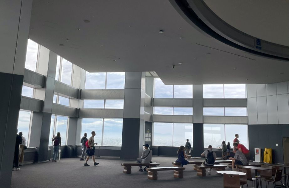 The observation deck on the 45th floor felt surprisingly relaxed for such an important building. The space was wide and bright, lined with tall glass windows that wrapped around the tower, offering views in every direction.