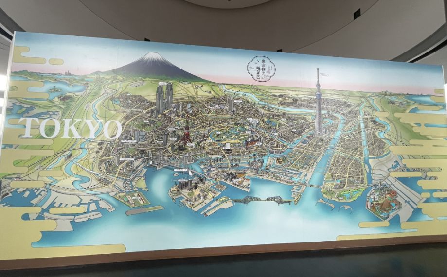 Map of Tokyo that shows Mountain Fujii in the distance, and on the right Tokyo tower.