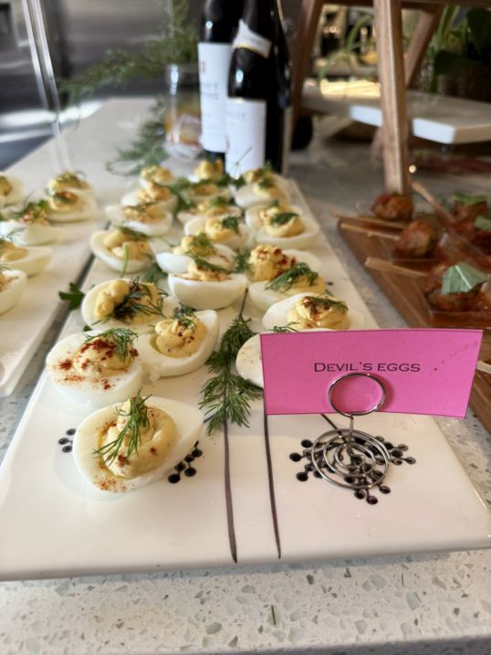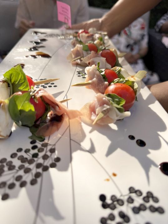 Mozzarella, tomato, basil, prosciutto skewers drizzled with balsamic vinegar.