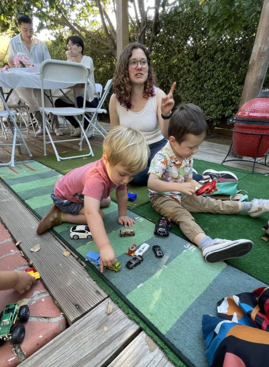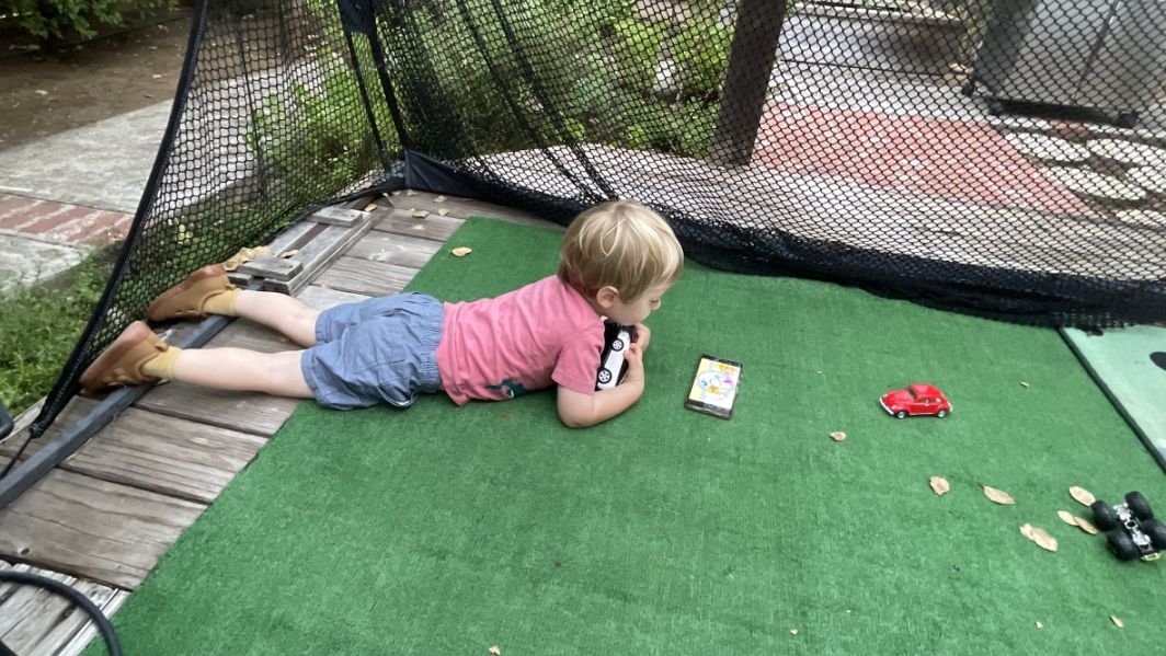 Off to the side, a cozy corner that was originally set up for Golfputting but it became a fun place where kids played with toys while their parents sat nearby, enjoying the cheerful scene.