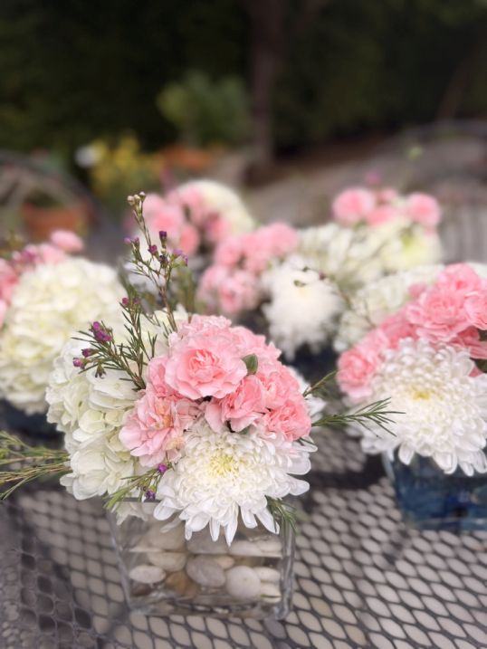 Six tables, each decorated with soft pink touches in honor of their baby girl.