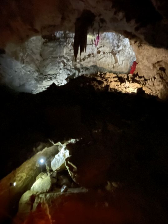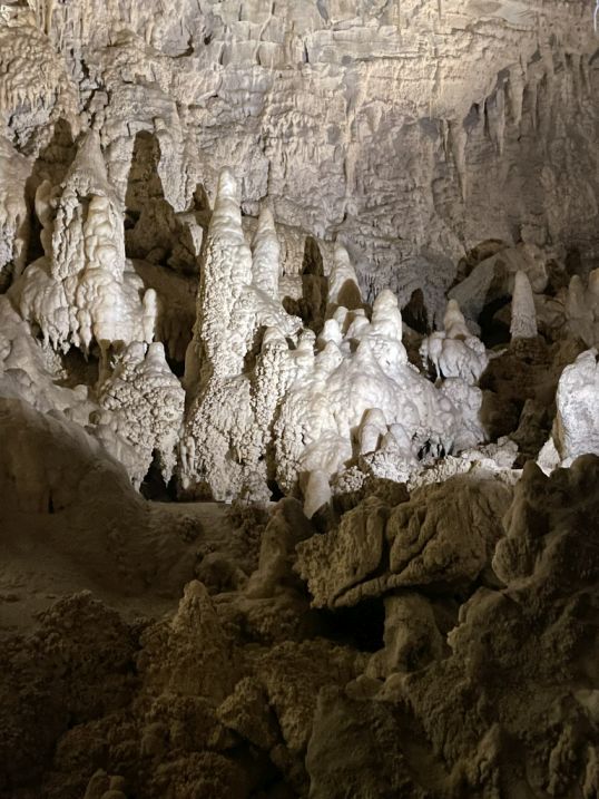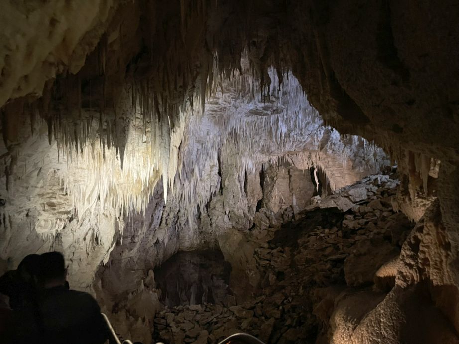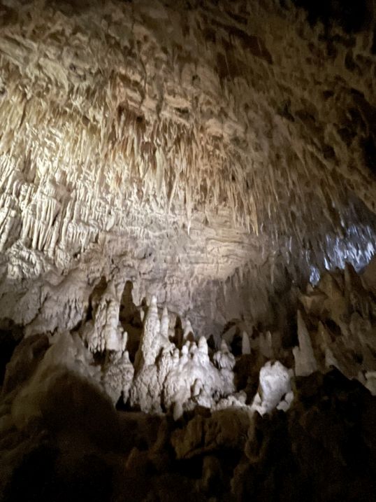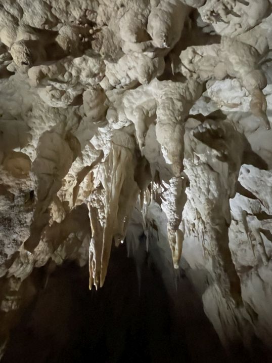 We are now entering the Shark Teeth chamber. This large cave room is sometimes described by guides as the “cathedral” or “shark mouth” chamber due to its impressive height and spacious feel, Clusters of narrow, pointed stalactites that hang like rows of fangs.