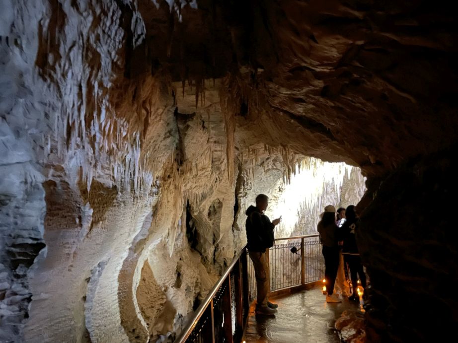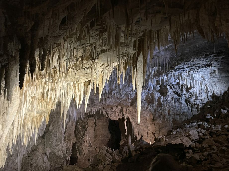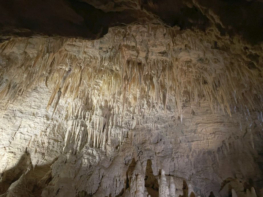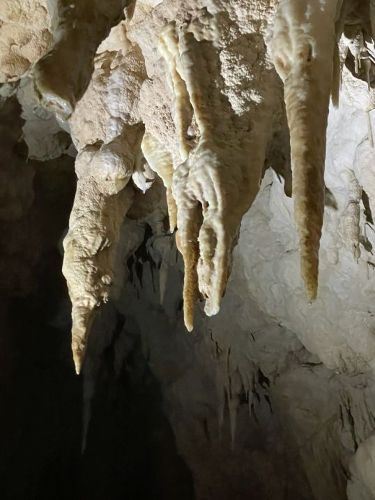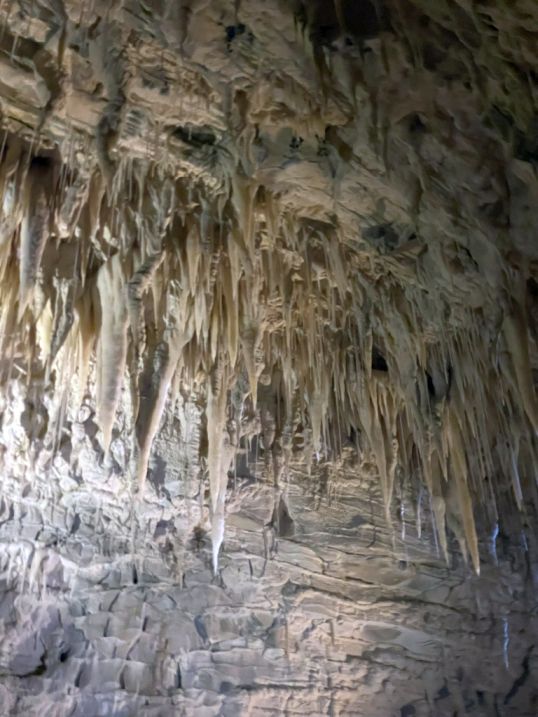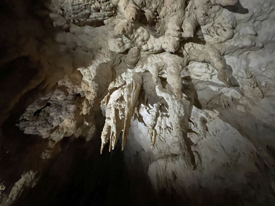 You’ll see both slender, needle-like stalactites and larger, thicker ones that resemble rocky chandeliers.