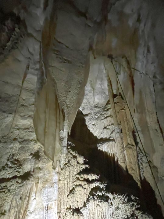 This area the stalactites looks like sheets or flowing fabric, they are known as “draperies”, or “curtains”, or sometimes “cave bacon” (because of their layered, wavy appearance).
