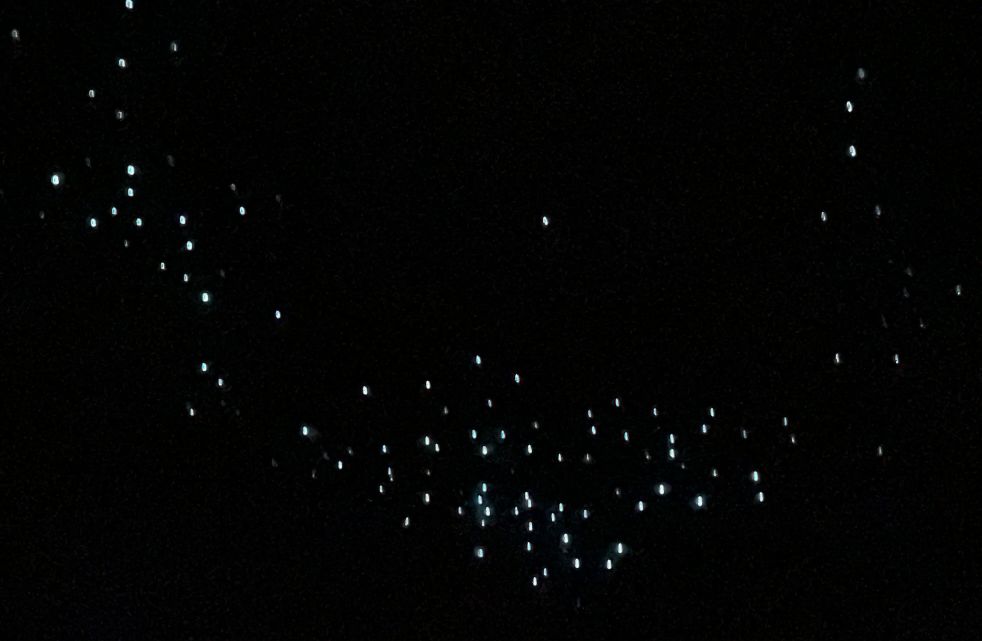 As the lights are turned off, the entire cave ceiling lights up with thousands of glowworms, glowing like a star-filled night sky.