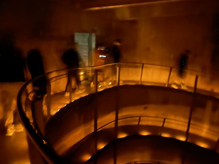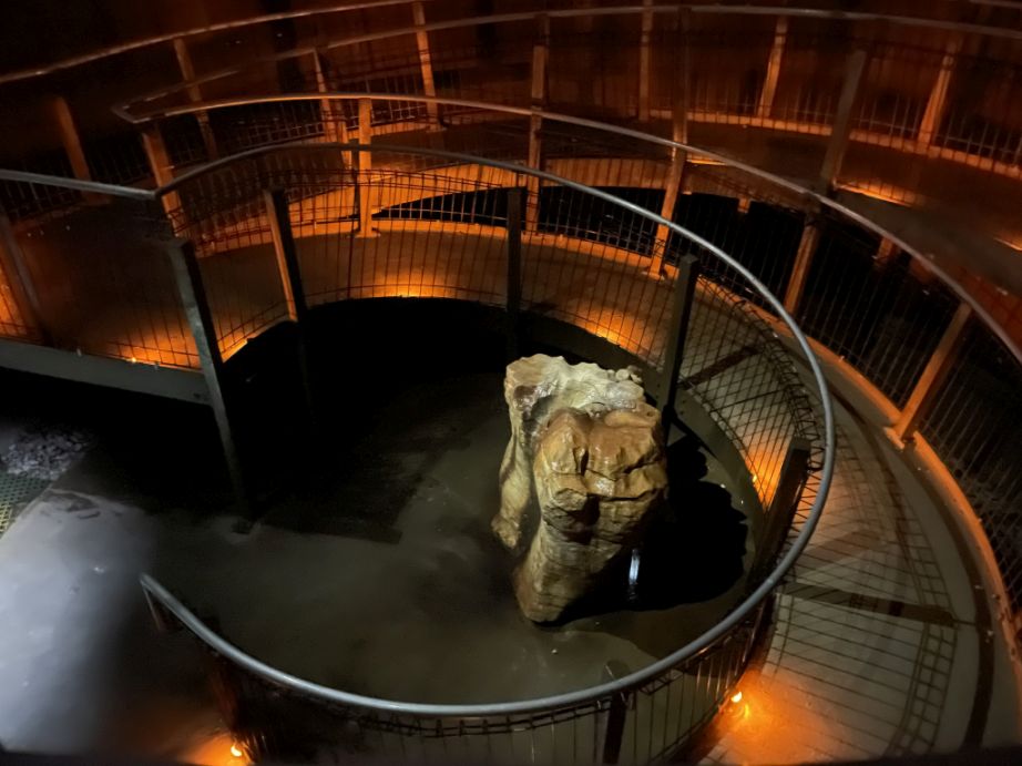 A distinctive circular structure leading down via a gentle spiral ramp to the bottom and entrance of the cave.