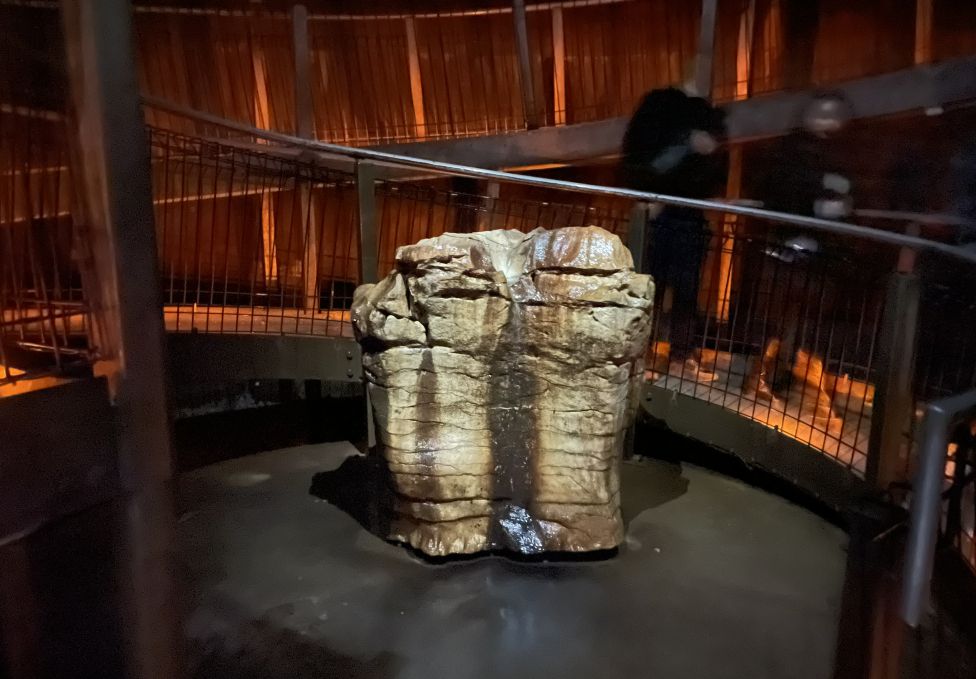 The big rock at the bottom of the circular ramp in Ruakuri Cave is a natural limestone boulder that has been left in place intentionally as both a scenic and symbolic centerpiece at the cave entrance.