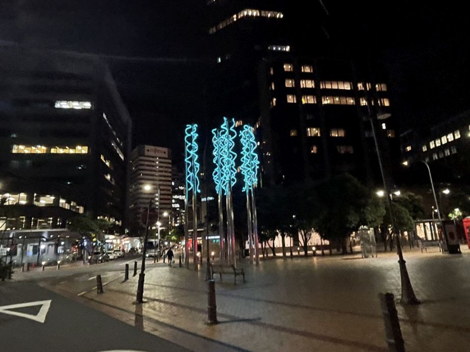 From the restaurant we walked by the Post Office Square, just off Grey Street and saw the seven slender steel poles topped with twisting blue neon lights, installed in 2006 as the public art sculpture “SkyBlues” by artist Bill Culbert. Its shimmering blue presence ties visually to Grey Street’s water feature, creating a mini-art-trail from Lambton Quay to the waterfront.