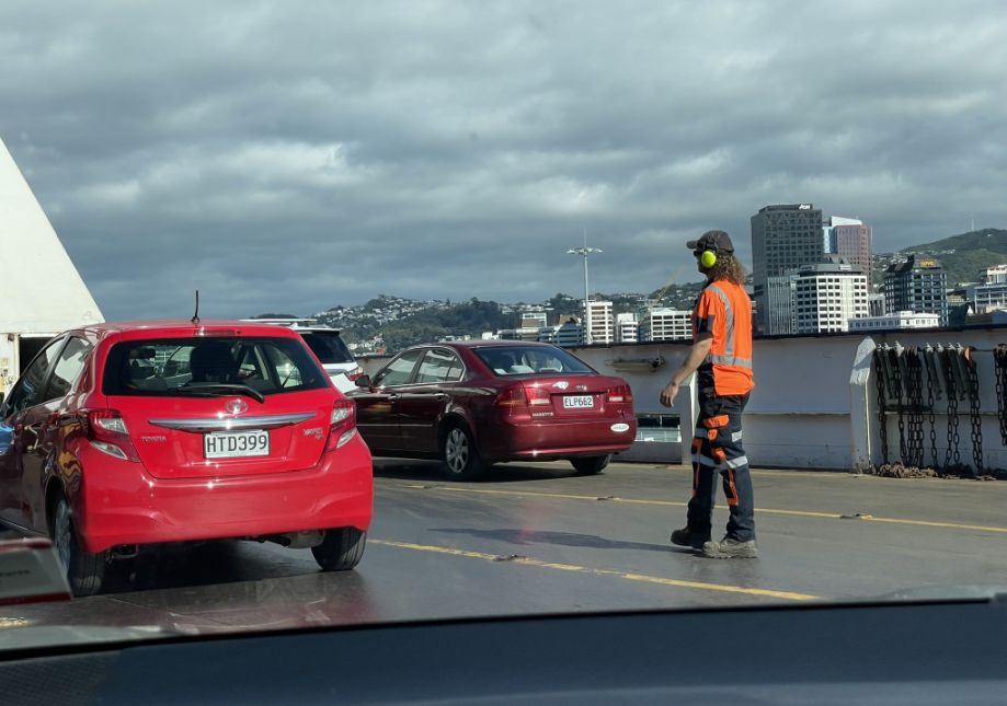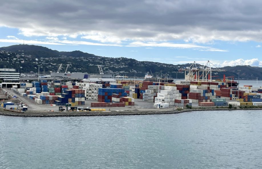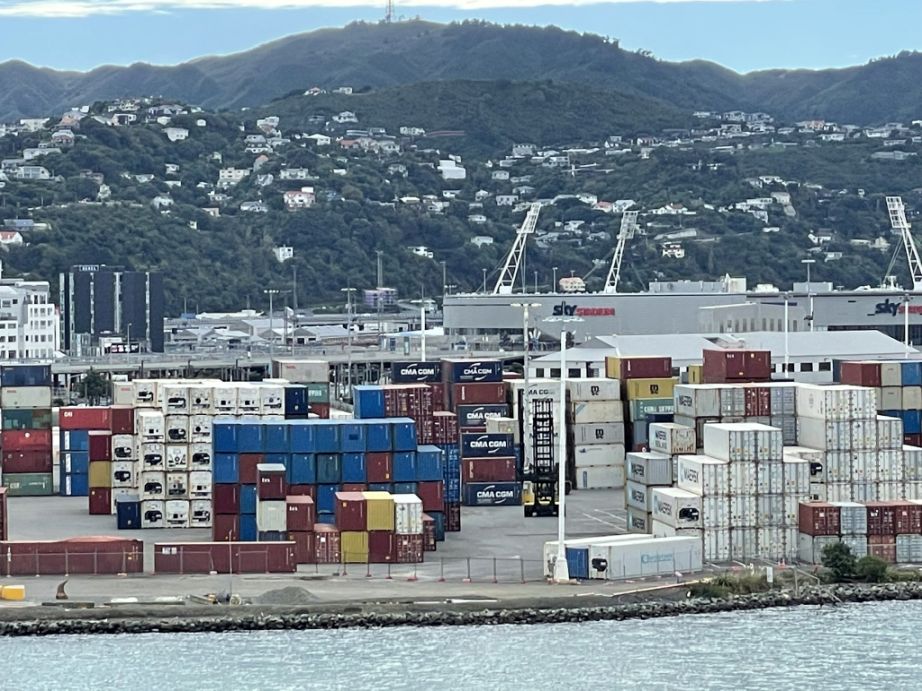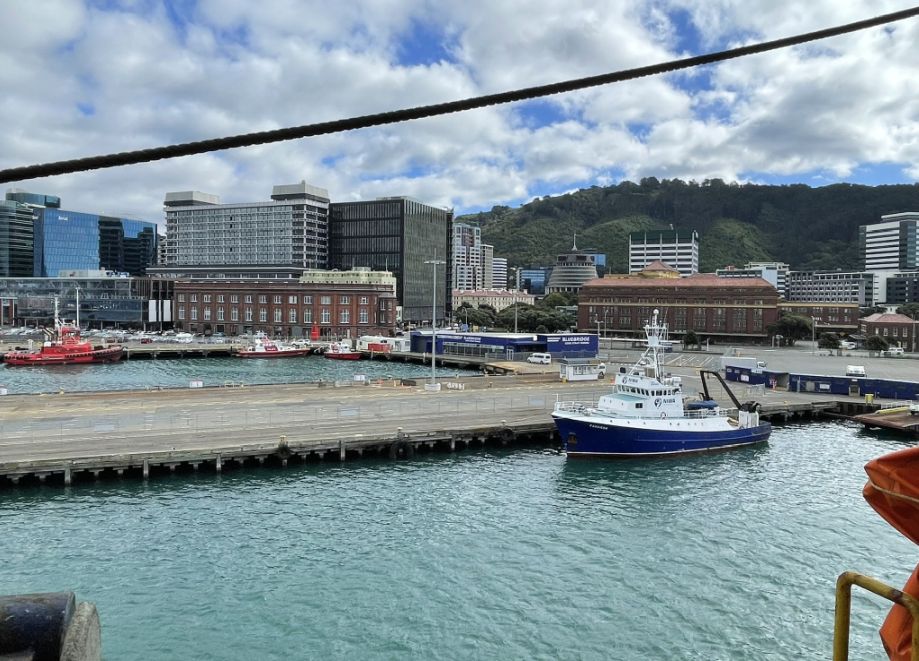 As the ferry is making it way out of the Queen’s Wharf in Wellington, it passes through or near one of the container and freight handling zones of the port, which is part of the busy, working harbor that supports New Zealand’s imports and exports.