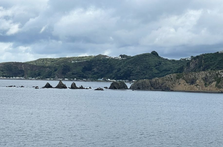 As the ferry exits Wellington Harbor, we passed the rocky coastline of Eastbourne and Pencarrow Head, where dark jagged rocks jut from the sea.