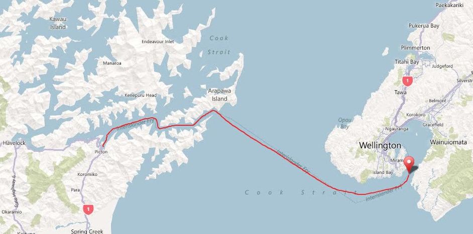 From the North Island (Wellington) to the South Island (Picton) via Cook Strait and Marlborough Sounds, the journey takes 3.5 hours and about 57 miles in distance.