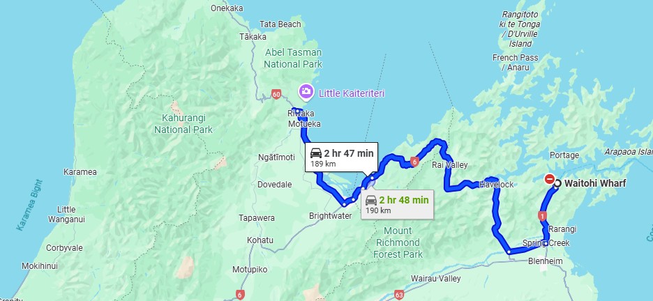 Once we got off the Picton Pier we had another 3 hours drive to Motueka (112 miles). When I booked the ferry I did not realized that by the time we reached Picton it was getting dark and in less than an hour we drove in total darkness. There is only on small road to Motueka and it was a narrow one lane and it was also very winding as you can see in the map. It was supposed to be a very picturesque drive but we saw nothing as the road did not have any lights. We were just glad when we made it to our Chalet in Motueka.