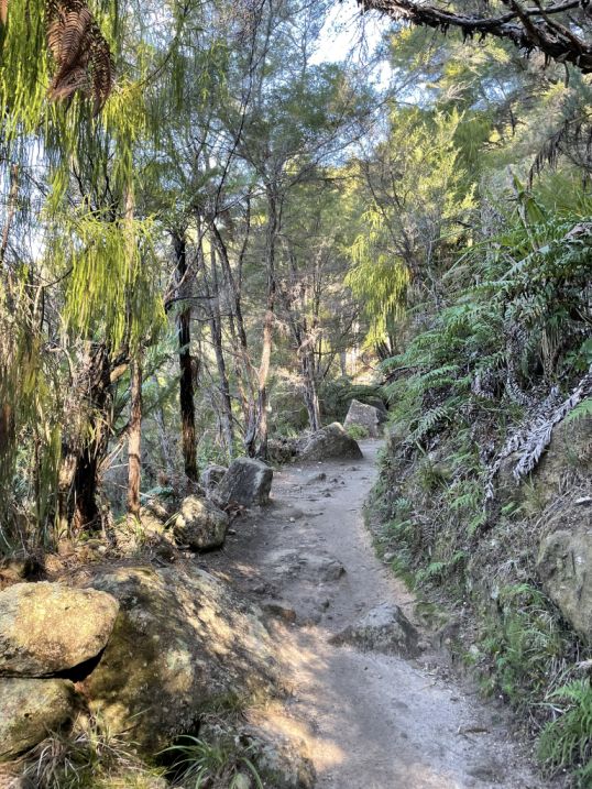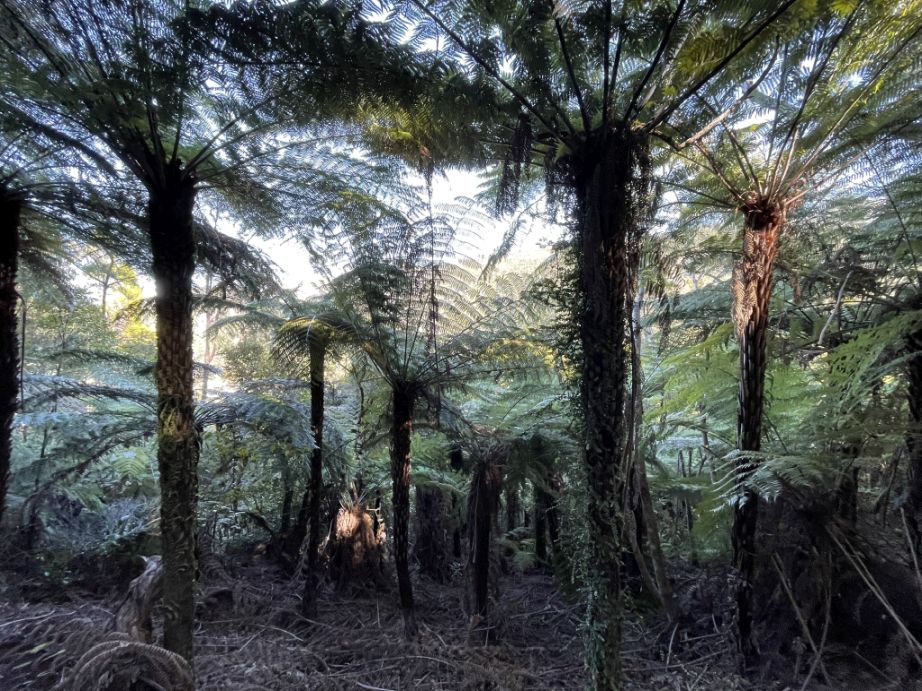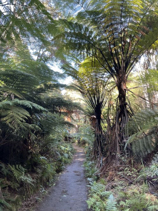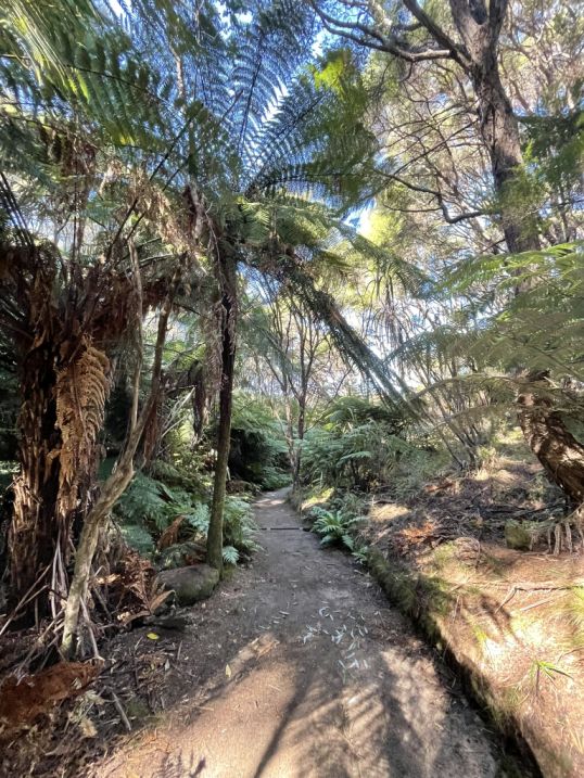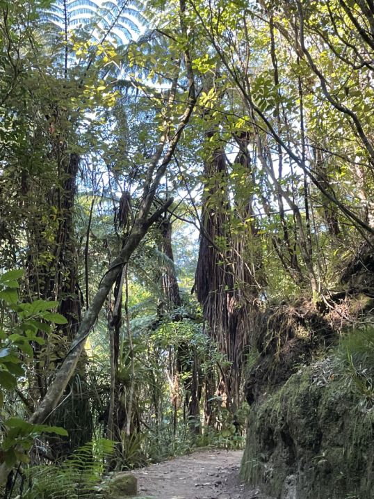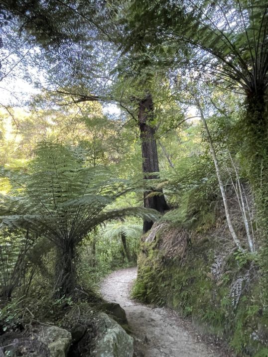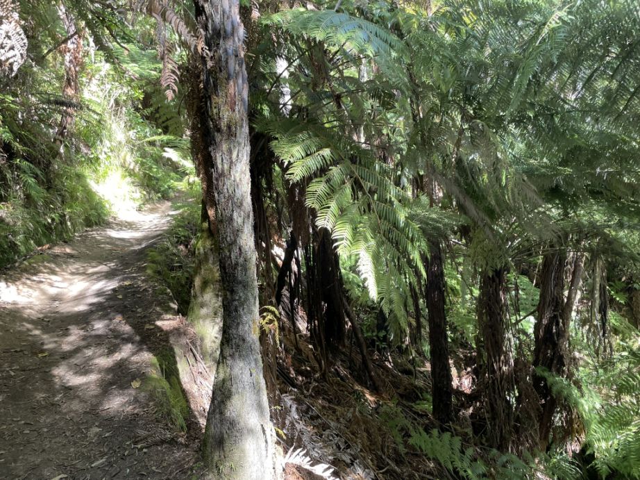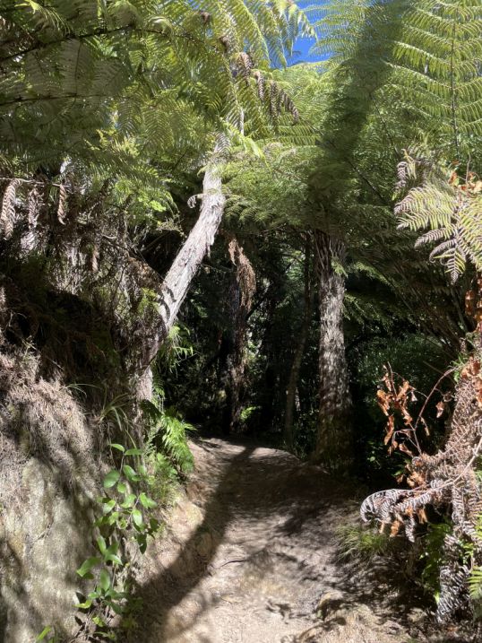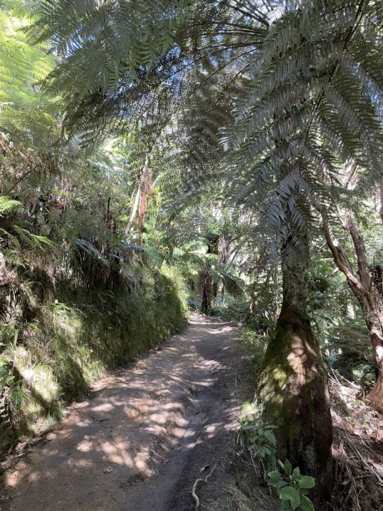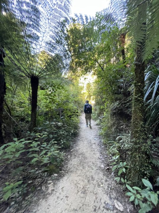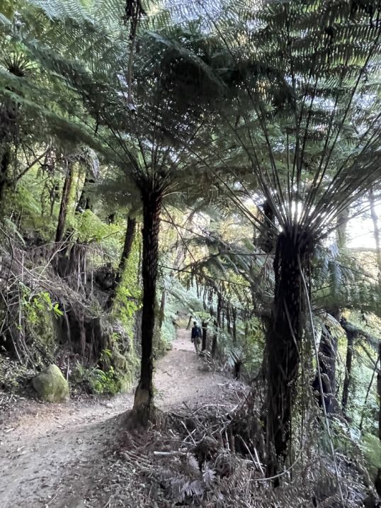 These towering ferns, likely mamaku (black tree ferns) or ponga (silver ferns) lined parts of the trail, their wide, arching fronds filtering the sunlight into a soft, green glow beneath the canopy.