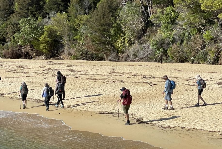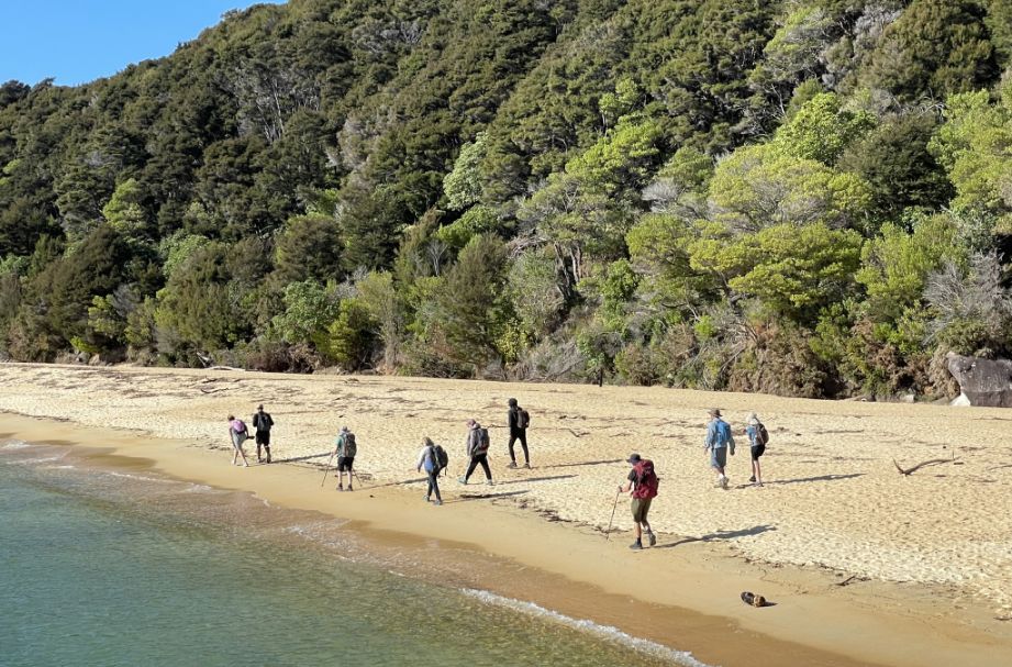 Hikers either arriving from or heading toward nearby points like Torrent Bay, Bark Bay, or Te Pukatea Bay. The track winds through lush native forest, offering stunning coastal views, swing bridges, and occasional wildlife encounters.