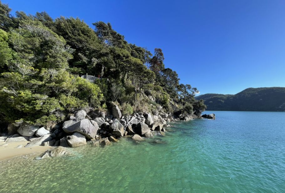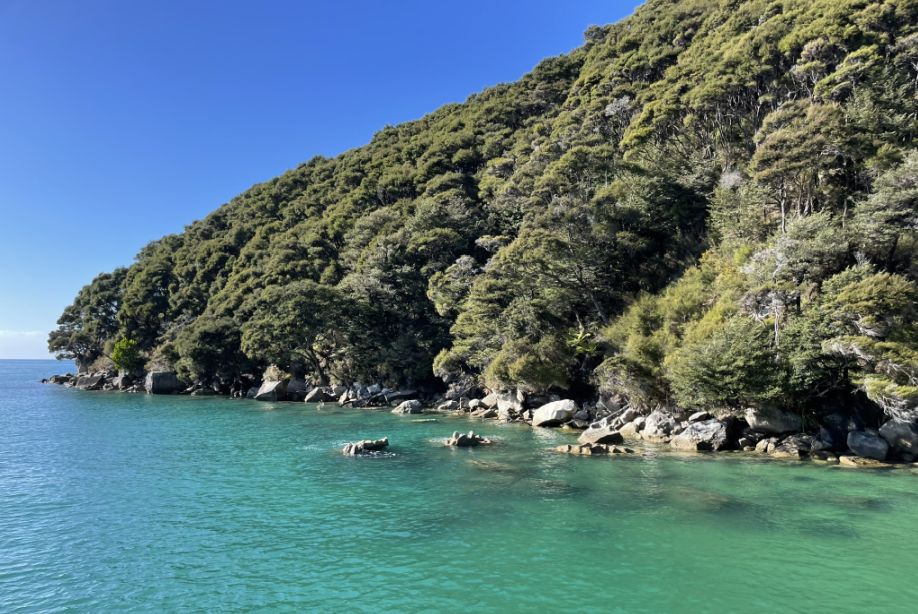 Rocky hills rise steeply, covered in dense native forest with mostly beech, kānuka, and rātā trees. The contrast between the rugged granite cliffs, emerald forest, and turquoise sea creates a scene that feels both wild and serene. It’s no wonder this spot is a favorite for hikers, kayakers, and anyone wanting to pause and take in the raw beauty of Abel Tasman National Park.