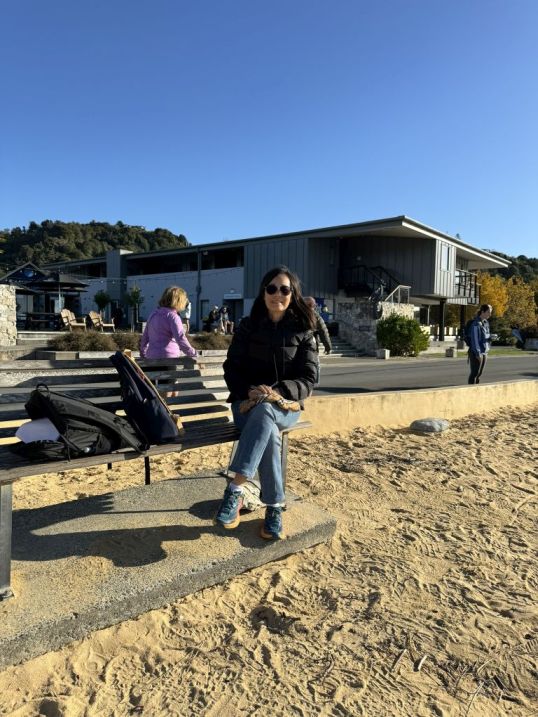 Waiting here is so peaceful with the view of the beach and the small town behind us.