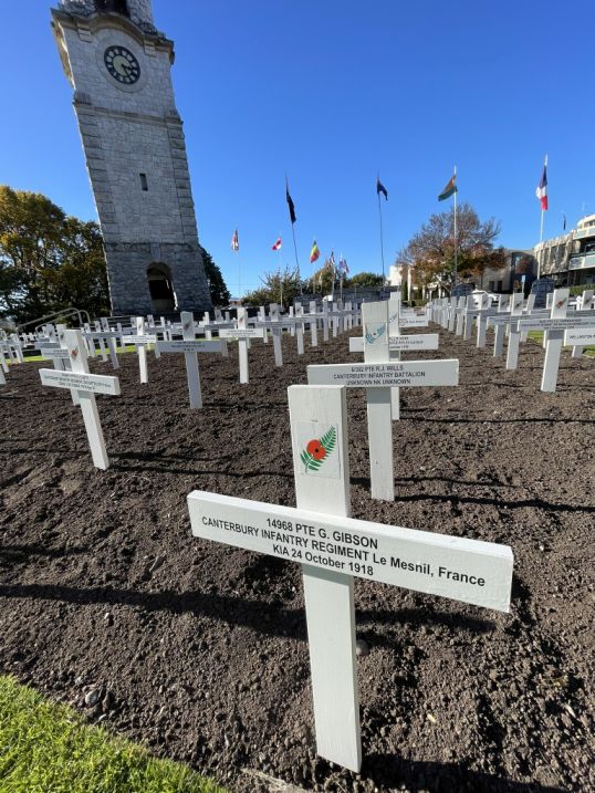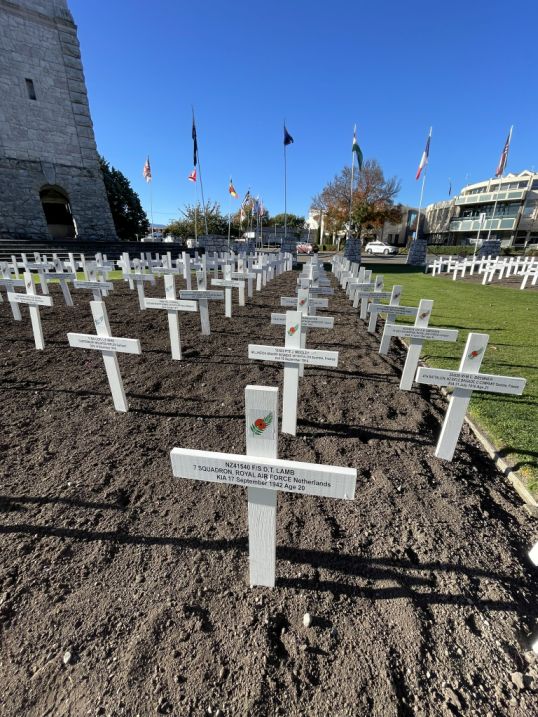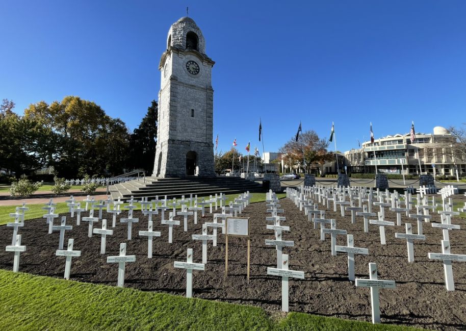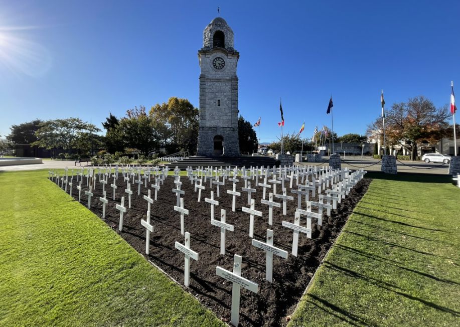 The field of white crosses you’re seeing in Blenheim is a deeply respectful tribute to those from the Marlborough region who gave their lives in service. It turns the public square into a space of reflection and national memory, surrounded by the quiet beauty of gardens, trees, and the sound of the fountain nearby.